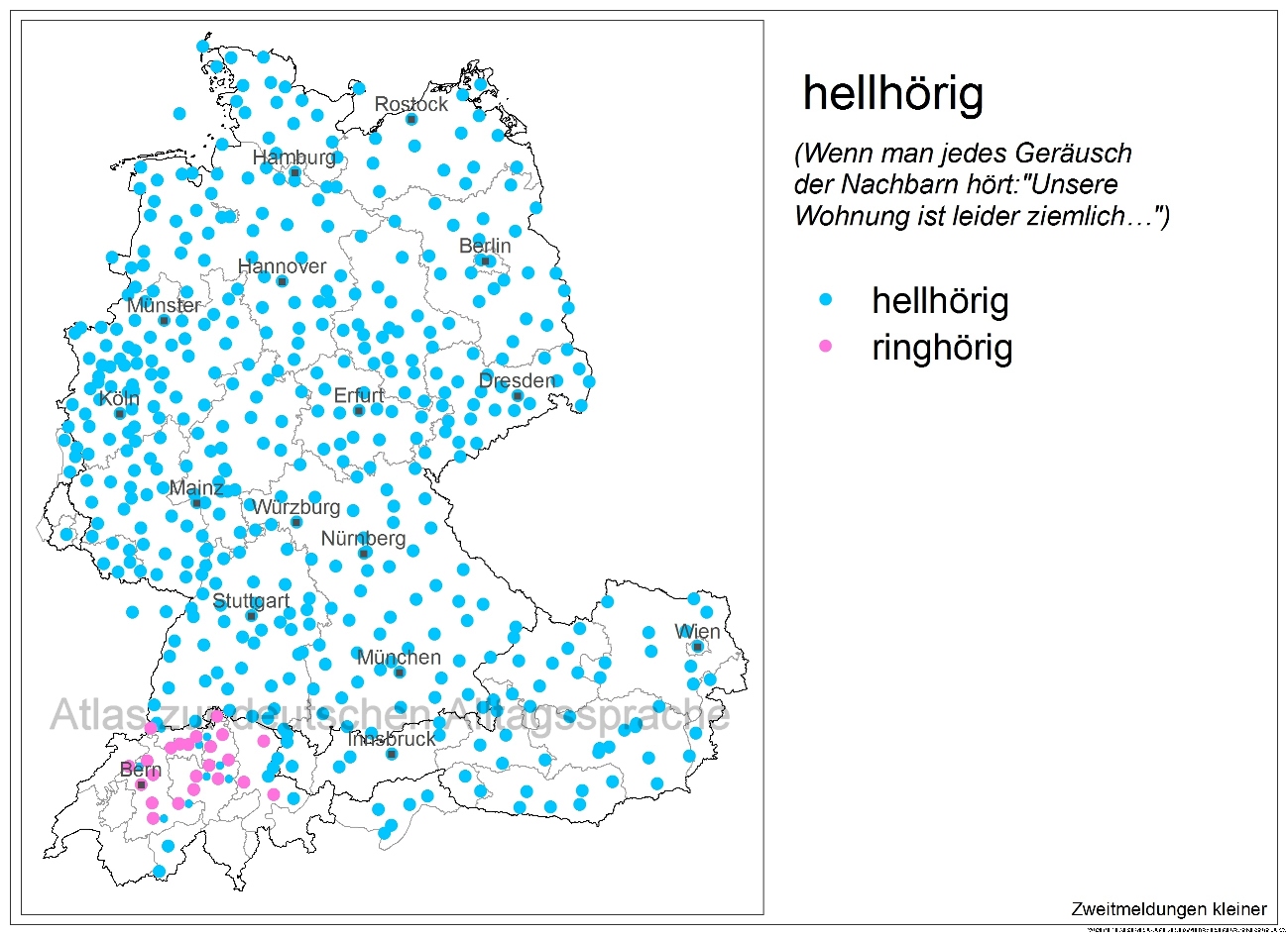 Wenn man jedes Geräusch der Nachbarn hört, sagt man in Deutschland, Österreich, Südtirol, Liechtenstein, Ostbelgien und Lothringen "Unsere Wohnung ist leider ziemlich hellhörig". Auch in der Schweiz wird teilweise hellhörig verwendet, ganz überwiegend ist hier aber ringhörig üblich.