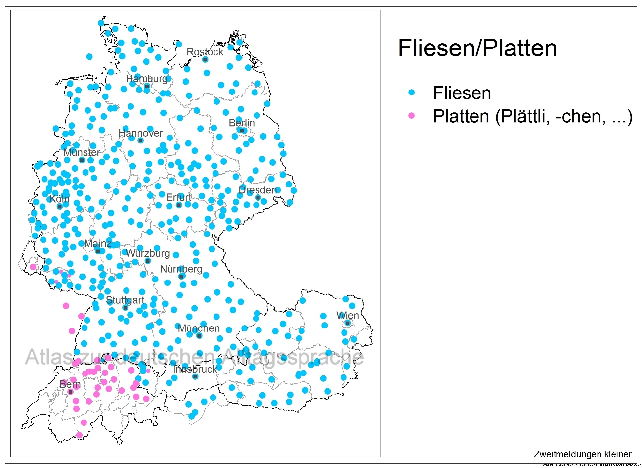 Die Karte gibt die Verteilung der Formen für den „abgebildeten wasserdichten Bodenbelag aus Steingut in Badezimmern u.ä.“ wieder. Im größten Teil des Sprachgebiets, vor allem in Deutschland, Ostbelgien, Österreich und Südtirol, wird dafür die Pluralform Fliesen verwendet. Fliese ist ursprünglich ein niederdeutsches Wort (mnd. vlīse ‘Steinplatte’), das im 17. Jahrhundert ins Hochdeutsche übernommen wurde; es kann vielleicht auf die indoeuropäische Wurzel *(s)plei- ‘spalten, abspalten, spleißen’ zurückgeführt werden, die auch dem Verb spleißen und Substantiven wie Spleiß und Splitter zugrunde liegen (Pfeifer).
