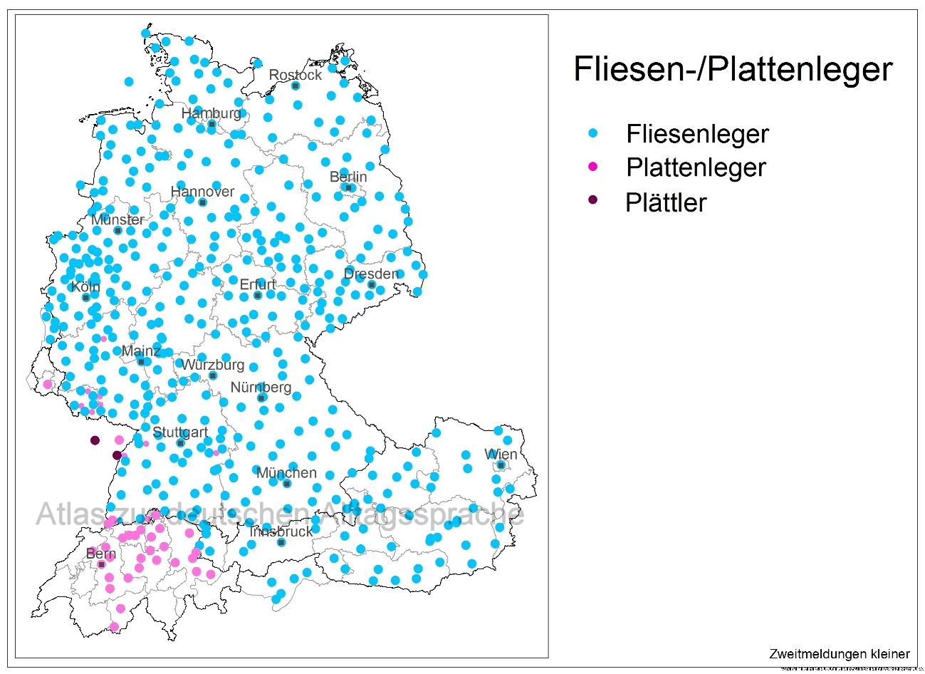 Die regionale Verbreitung der Bezeichnungen für den „Handwerker, der diesen Bodenbelag verlegt“, entspricht in etwa der Verbreitung von Fliesen und Platten: In Ostbelgien, Österreich und Südtirol sowie fast überall in Deutschland spricht man vom Fliesenleger, während in Luxemburg, in der Deutschschweiz und teilweise auch im Südwesten Deutschland von Plattenleger die Rede ist. Eine eigene Form zu Platten, nämlich Plättler, hat sich im Elsass und in Lothringen etabliert.